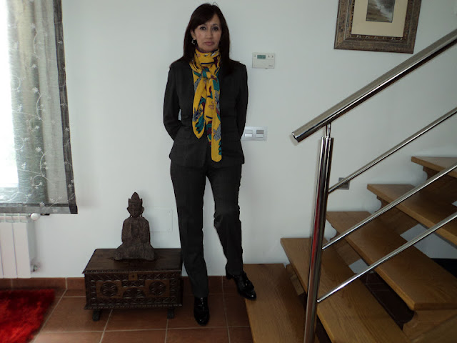 Este clásico traje de pantalón, que nunca se pasa de moda, ya tiene varias temporadas. Lo llevo con un cisne y para darle un aire más fresco y actual, lo acompaño de un pañuelo de Bimba y Lola de esta temporada. Otra vez los complementos logran con un solo gesto, renovar el vestuario. Espero que os guste.