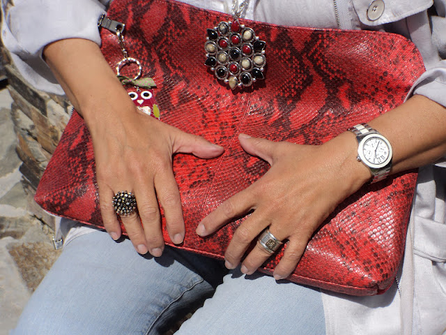 Es la prenda por excelencia del fondo de armario y mi favorita en esta época. Completo el look con unos vaqueros de hace varias temporadas, lo mismo que la camisa blanca, otra prenda imprescindible del fondo de armario.El color lo pone la cartera que personalicé con un colgante. Espero que os guste.