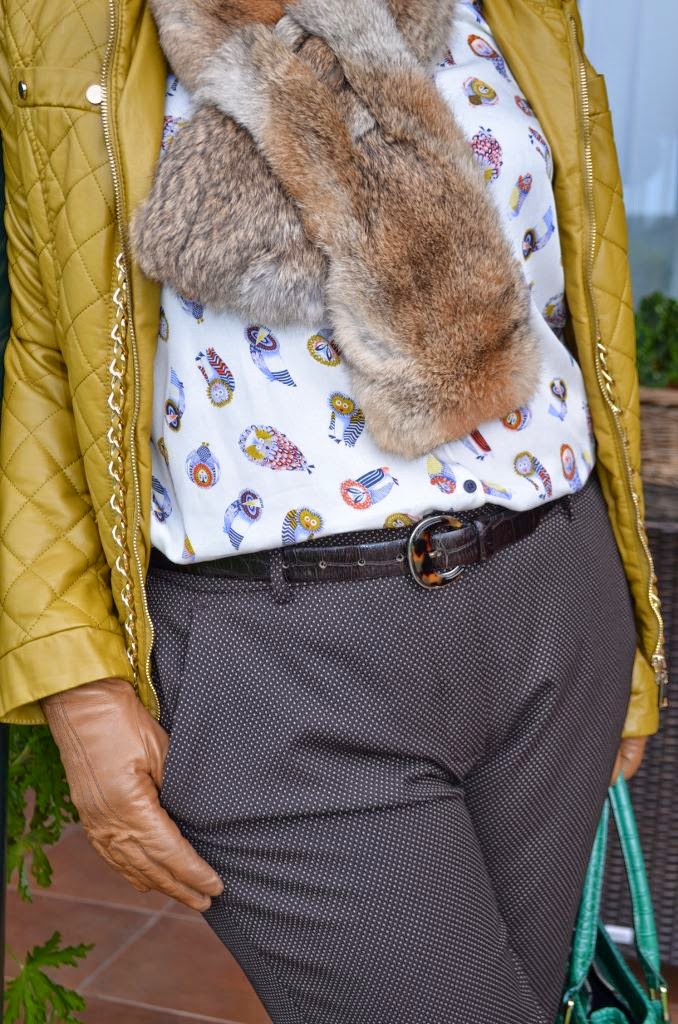 32. Qué bonita combinación de tonos, el de la chaqueta con el contraste verde del bolso, y los búhos!! Maravilloso look, estás estupenda. Un besazo!!!